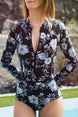 Long sleeved swimsuit featuring a floral print design and a front zipper.